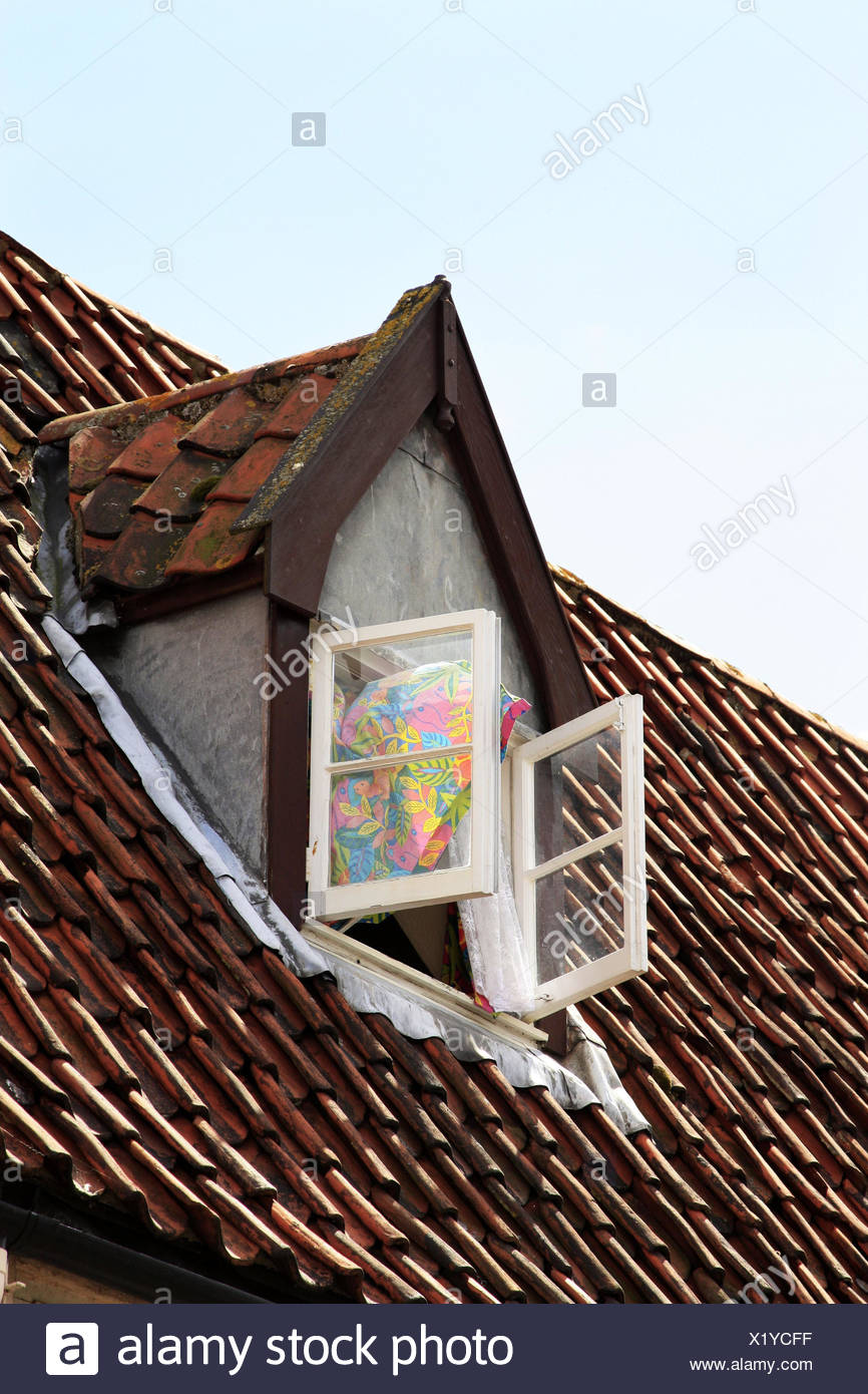 Sul Tetto Della Casa Abbaino Finestra Aperta Tenda Soffiaggio Casa Appartamento Sottotetto Soffitta Tetto In Legno Finestra Aperta L Aria All Aperto Foto Stock Alamy