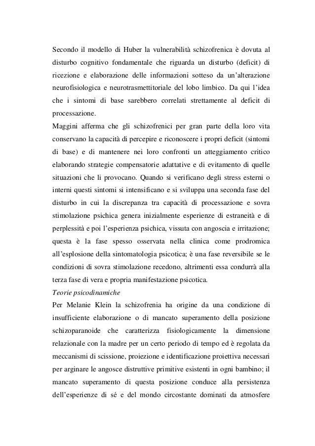 Elenco delle tesi pubblicate che approfondiscono il tema Psicosi, ordinate in base alla data di pubblicazione Sono liberamente consultabili l'abstract e le prime 10 pagine dell'introduzione Registrandosi è possibile scaricare gratuitamente le preview delle tesi in PDF (circa 1015 pagine). Obiettivo della presente rassegna è descrivere le principali evidenze di efficacia sulla psicoeducazione nella schizofrenia sulla base di importanti revisioni e metanalisi condotte nell’ultimo decennio e di singoli studi relativi alle peculiarità di intervento sui pazienti e sui familiari Discussione e conclusioni. Entra sulla domanda Tesina sulla schizofrenia e partecipa anche tu alla discussione sul forum per studenti di Skuolanet.