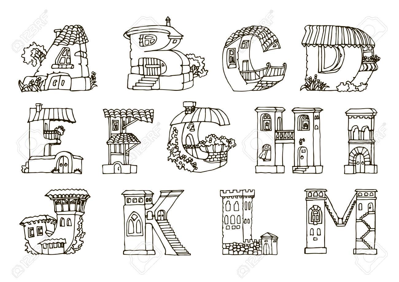 Vettoriale Alfabeto Della Lingua Inglese Le Lettere In Forma Case Carattere Disegnata A Mano Con Stile Retro Set Handmade Casa Alfabetico Illustrazioni Per Font Formazione In Bianco E Nero Disegno Delle