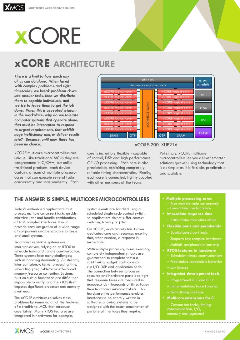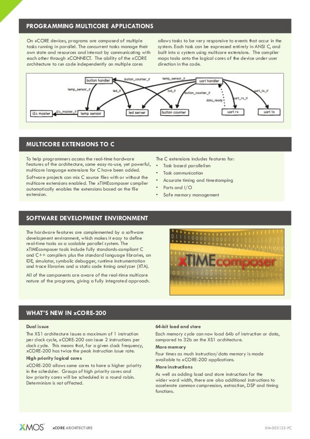 MW1 8Apr I see that on lib_rtos_support – which is a software library that provides support for running an RTOS on xCORE Any RTOS lib_soc provides a system on chip like platform in which an RTOS application may run. FreeRTOS port for XMOS xcore0 multicore microcontrollers Post by mbruno » Thu Jan 16, 452 pm XMOS has released an SMP (Symmetric multiprocessing) FreeRTOS port along with a peripheral support library for xcore0 silicon devices. The Multichannel Audio Platform hardware is based around the XETQ128 multicore microcontroller an xCORE0 device with an integrated High Speed USB PHY and 16 logical cores delivering up to 00MIPS of deterministic and responsive processing power.
