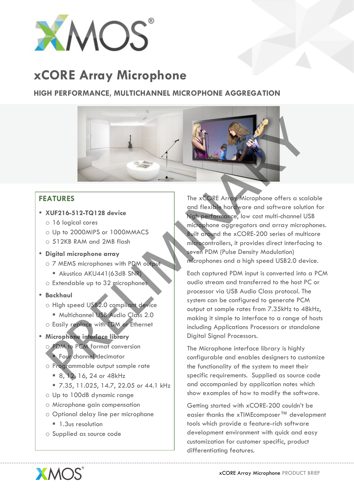 The XMOS xCORE0 platform uses a switch to connect multiple cores together A core can wait for an event providing instant response without interrupt handlers. The onboard XS1A864DEV xCORE multicore microcontroller includes an onchip debug capability that allows comprehensive realtime incircuit analysis of the complete design. XCOREAUDIO is an optimised variant of the XMOS xCORE0 multicore microcontroller, with the stereo HiRes2 sampling now, and will cost less than $0 in high volume The first xCOREAUDIO Live products will follow in April 15.