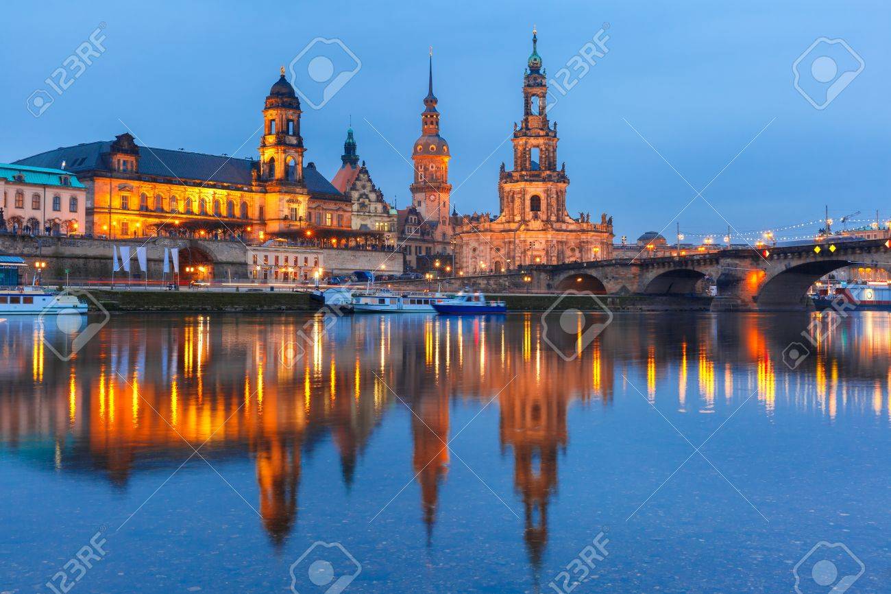 Immagini Stock Dresda Cattedrale Della Santissima Trinita Alias Hofkirche Cattedrale Santissima Trinitatis Terrazza Di Bruhl Alias Balcone D Europa E Il Ponte Di Augusto Con Riflessi Nel Fiume Elba Alla Notte A