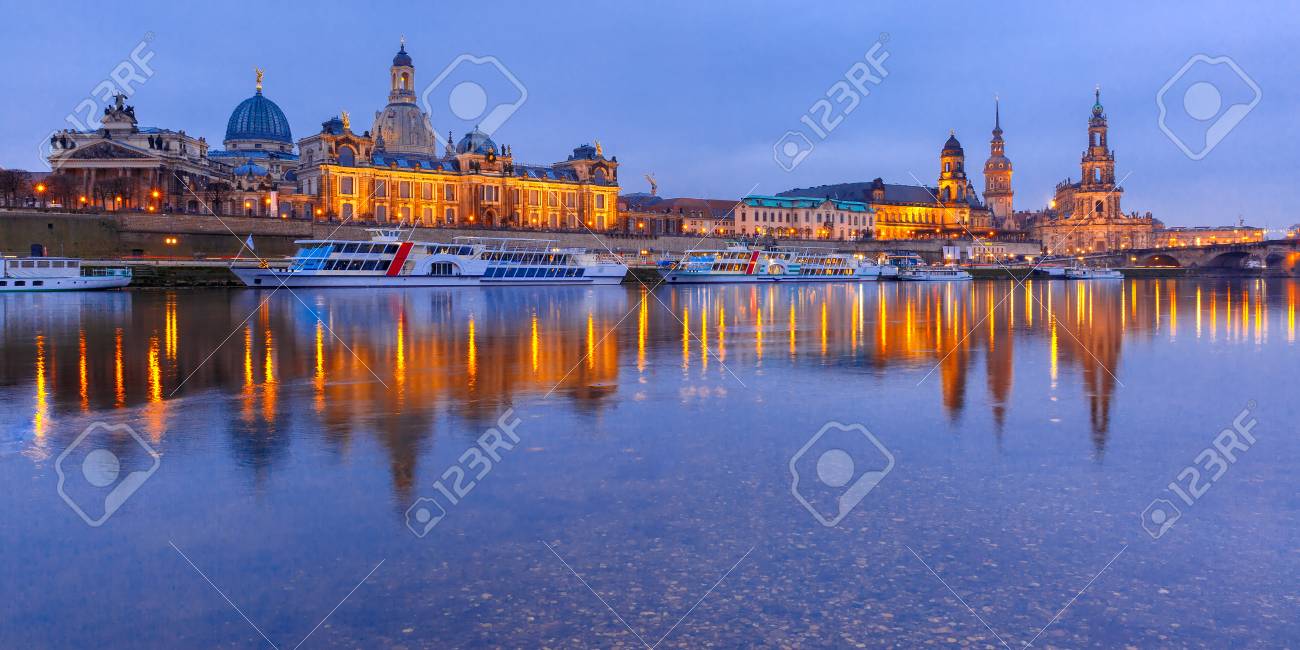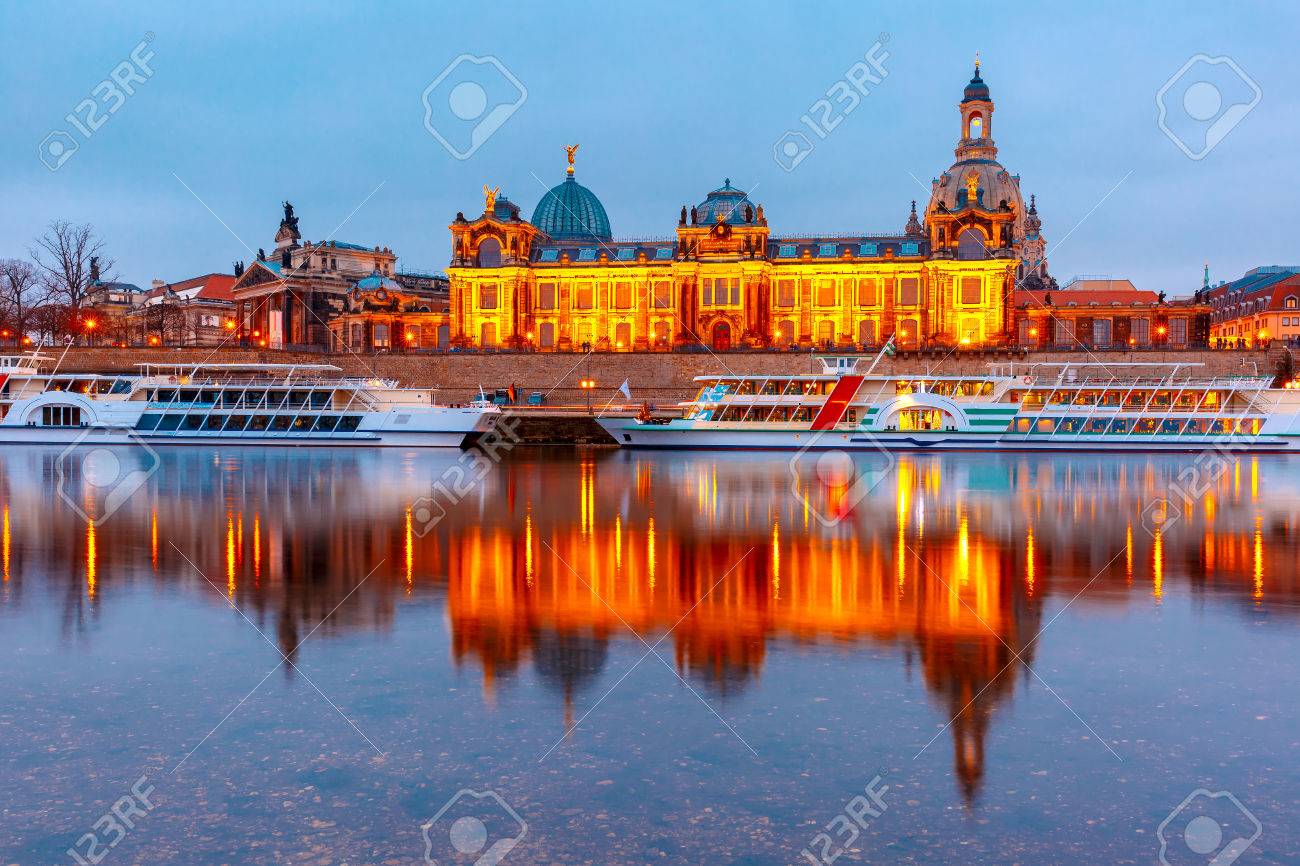 Immagini Stock Accademia Di Belle Arti Navi Turistiche E Terrazza Di Bruhl Alias Balcone D Europa Con Riflessi Nel Fiume Elba Alla Notte A Dresda Sassonia Germania Image