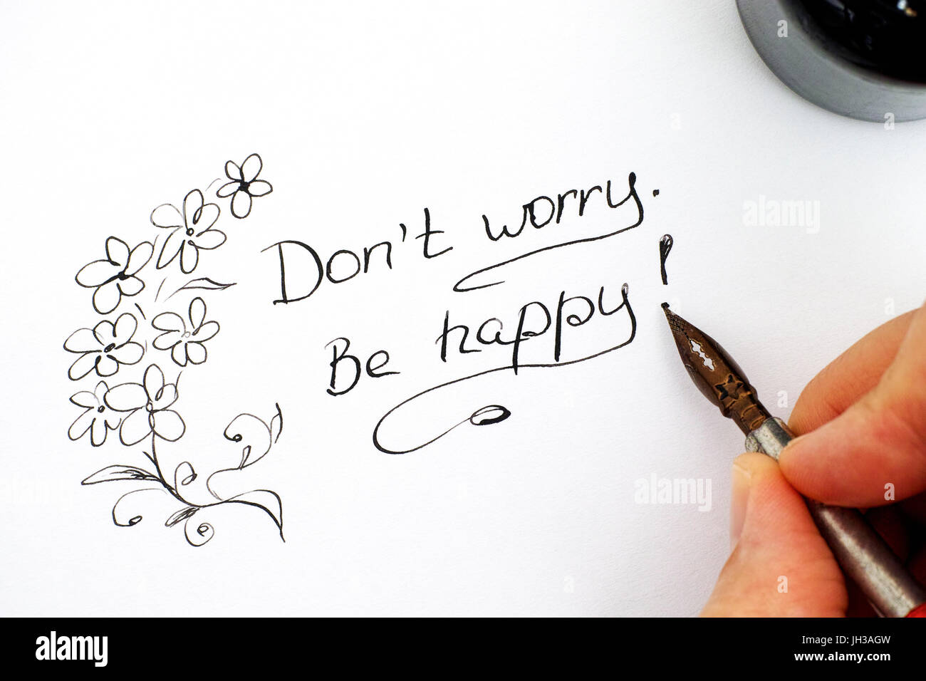 Woman Fingers With Pen Writing Phrase Do Not Worry Be Happy And Stock Photo Alamy