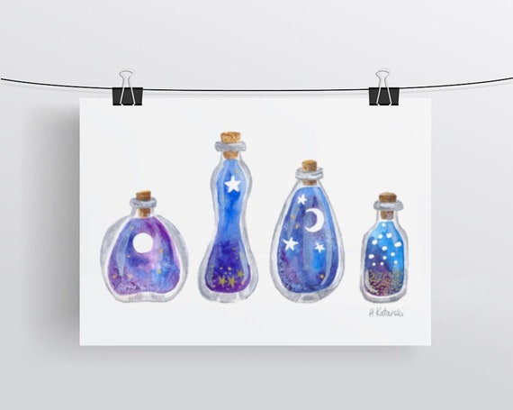 Watercolour Magic Potion Bottles Art Print Blue And Etsy
