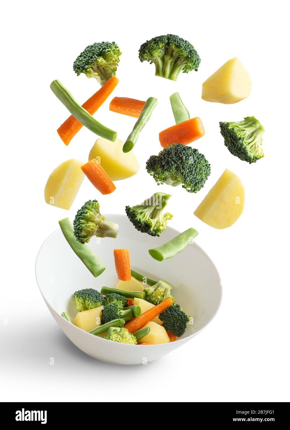Verdure Bollite Che Volano Su Sfondo Bianco Fagiolo Verde Broccoli Patate Carota Foto Stock Alamy