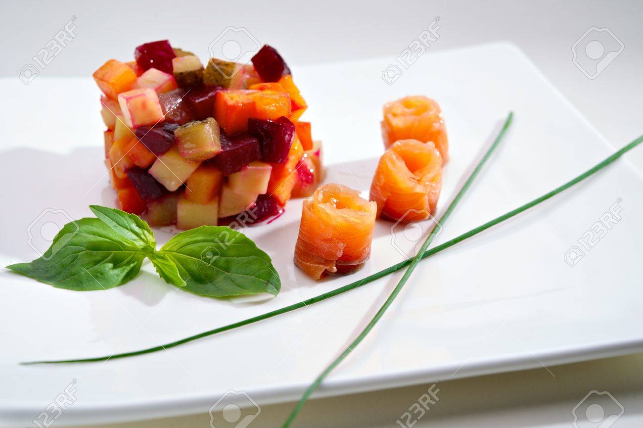 Immagini Stock Antipasto Di Insalata Vinaigrette Con Verdure Bollite E Filetto Di Salmone Profondita Di Campo Image
