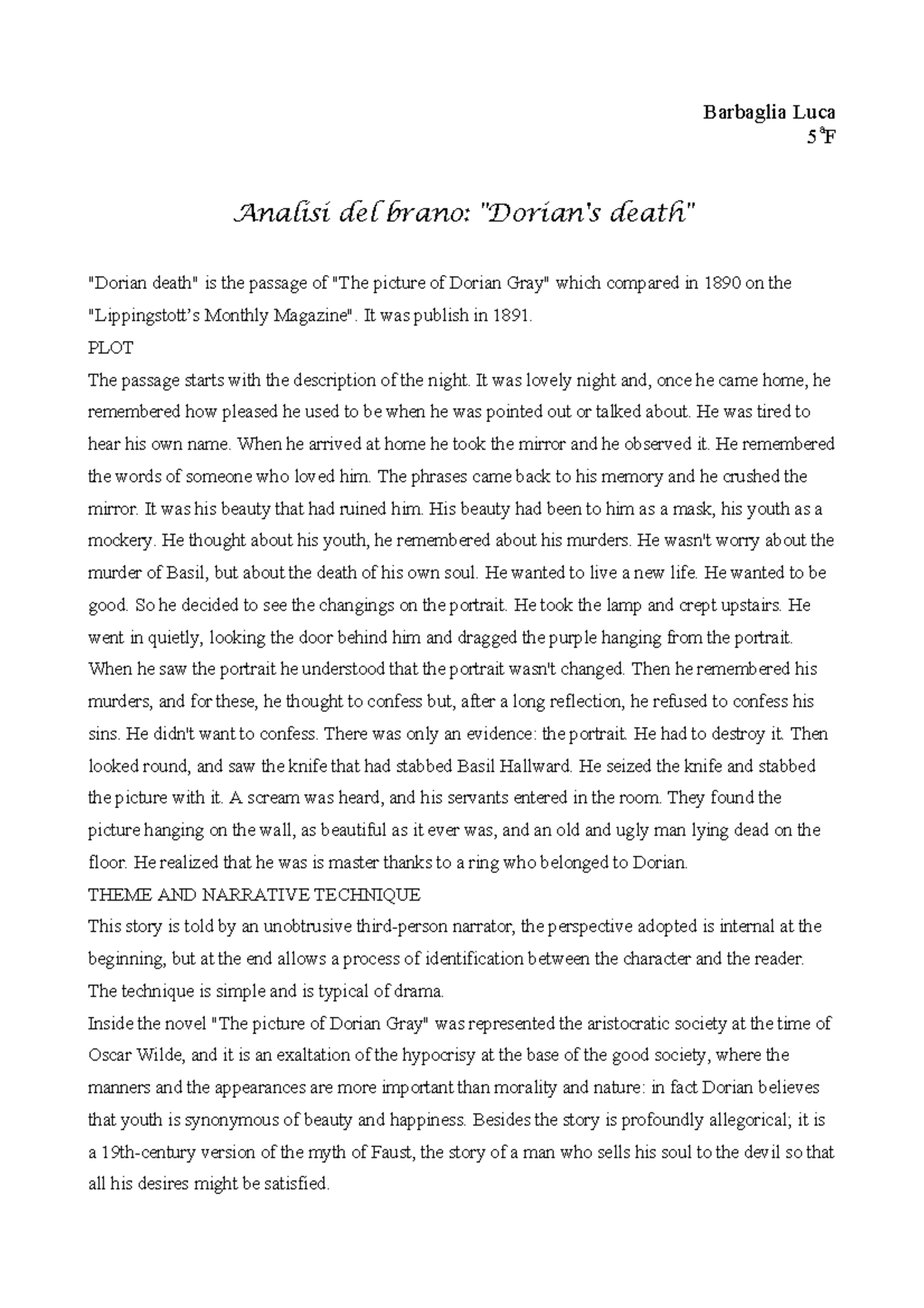 Riassunto Inglese Sul Brano Morte Di Dorian Studocu