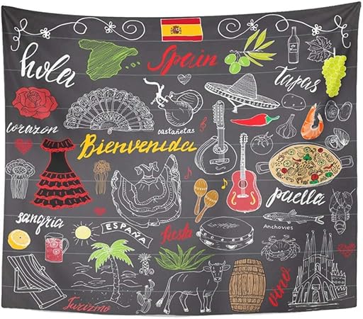 Soefipok Arazzo Tessuto In Poliestere Stampa Home Decor Spagna Doodles Con Lettering Spagnolo Cibo Paella Gamberetti Olive Grape Fan Vino Wall Hanging Arazzo Per Soggiorno Camera Da Letto Dormitorio Amazon It Casa E