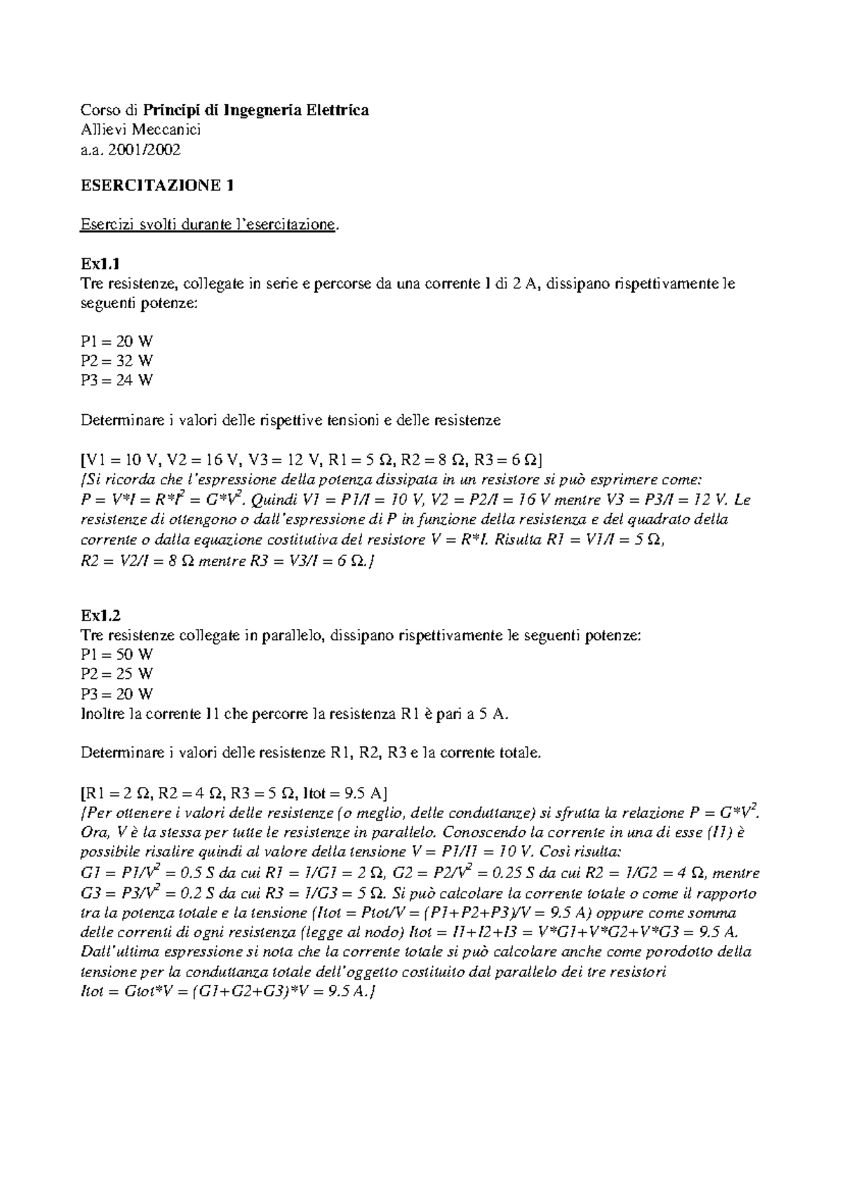 Esercitazioni Svolte Con Soluzioni Corso Di Principi Di Ingegneria Elettrica Allievi Meccanici Esercitazione Esercizi Svolti Durante Ex1 Tre Resistenze Studocu