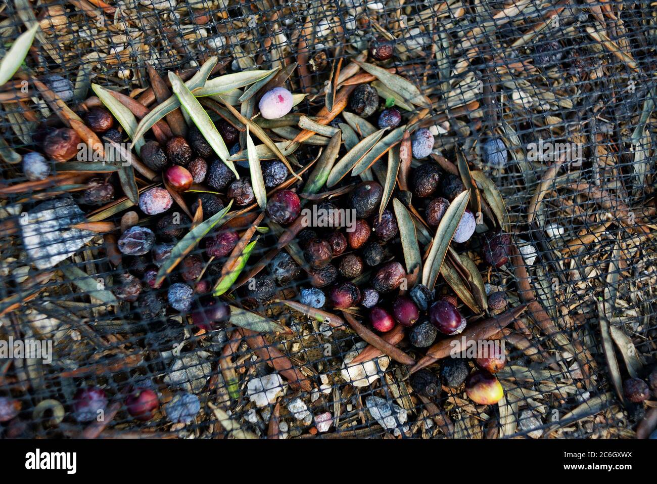 Cumulo Di Olive Nere Sulla Rete Durante La Raccolta Lesbo Grecia Foto Stock Alamy
