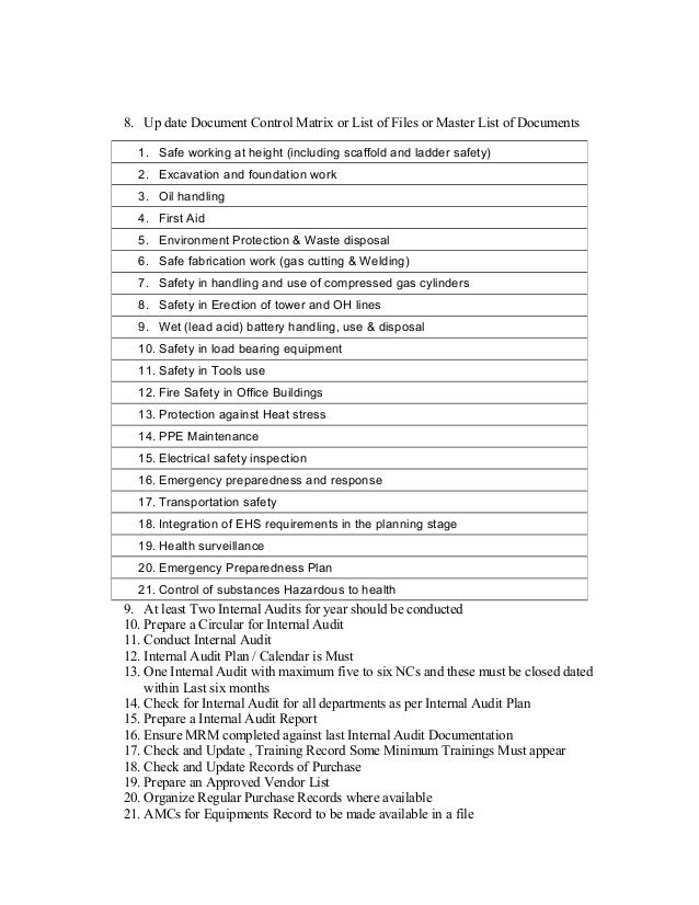 Master List Cum Distribution List of Documents Change Note 84 Corrective action report 85 Master List of Records 86 Quality objectives (key performance indicator) D135 DEMO OF ISO DOCUMENT KIT Price 450 USD Complete editable ISO document kit (Manual, procedures, SOPs, exhibits, formats, audit checklist etc). What should be the name of 'Master list of records & Master list of documents' as per ISO because here only Documented Information written on All the eBooks you need to implement ISO 9001 , ISO and AS9100. Take a look at one of the previous posts Master Document List You could modify it accordingly to suit your needs !.