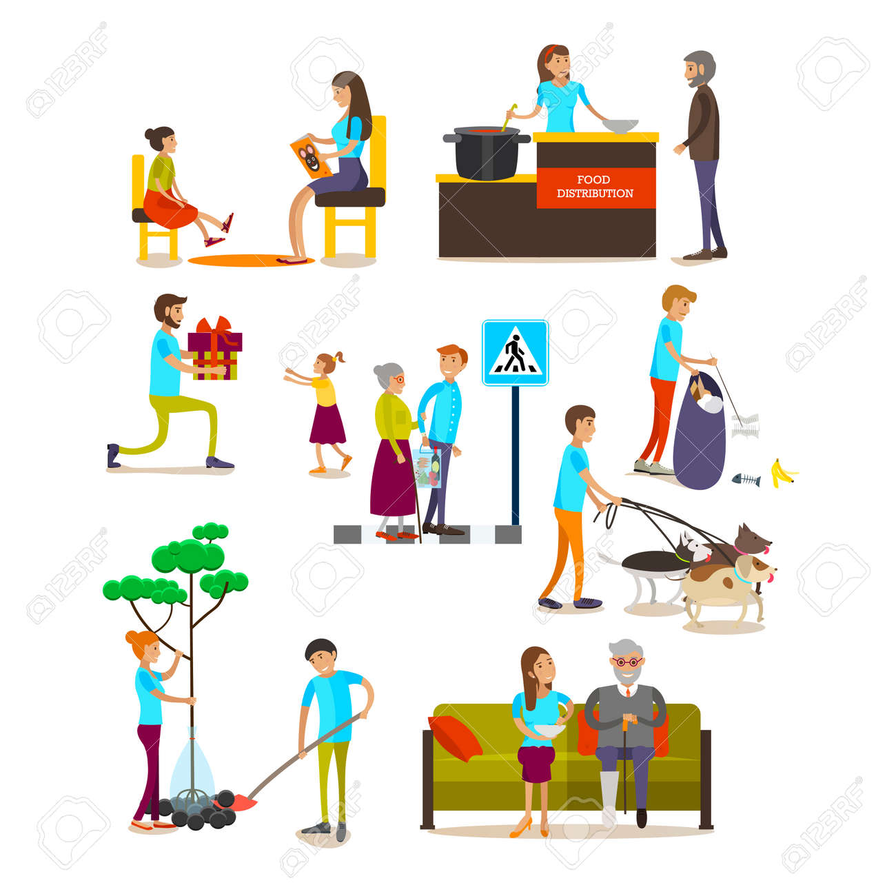 Vector Set Of Volunteers Helping Lonely Kids The Elderly With Royalty Free Cliparts Vectors And Stock Illustration Image