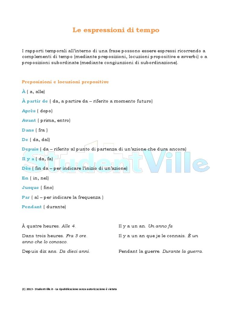Approfondimento grammaticale, pratico e teorico, riguardo all'utilizzo in lingua inglese degli avverbi di frequenza e di alcune espressioni di tempo tra le più comuni. Espressioni di tempo in italiano Sono espressioni di tempo alcune locuzioni avverbiali costruite con varie preposizioni, come ad esempio sul presto, sul tardi, di quando in quando, in tempo, tutt’a un tratto, nel frattempo, alla fine La mattina dopo il calendario prevedeva sul tardi una riunione dei capigruppo al Senato («La Repubblica») Arisa “Sogno di tornare a Sanremo e nel. Il sonoro è disponibile per tutte le frasi in italiano di questa pagina — devi solo cliccare su una frase per sentirla.