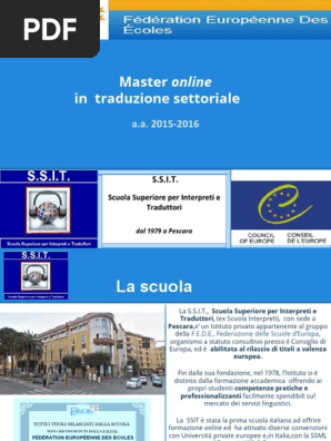 Documenti simili a MASTER IN TRADUZIONE SETTORIALE Ssit Pescara 1516pdf Carosello precedente Carosello successivo Antiquorum philosophia an international journal 6, 12pdf. Scuola di inglese a Pescara composa da Insegnanti madrelingua impartisce corsi di lingua inglese livello base, svedese e tedesca adatto ad ogni livello a Londra, dove ho anche avuto modo di perfezionare il mio inglese dopo aver conseguito la laurea in Traduzione ed Interpretariato Infatti. Io ho appena concluso il Master online istituito dalla SSIT di Pescara e devo dire che è un percorso molto interessante e ben strutturato I docenti sono traduttori esperti e molto disponibili a risolvere ogni genere di dubbio Alla conclusione del Master inoltre, la scuola offre ai suoi studenti visibilità sul sito ed altri vantaggi.