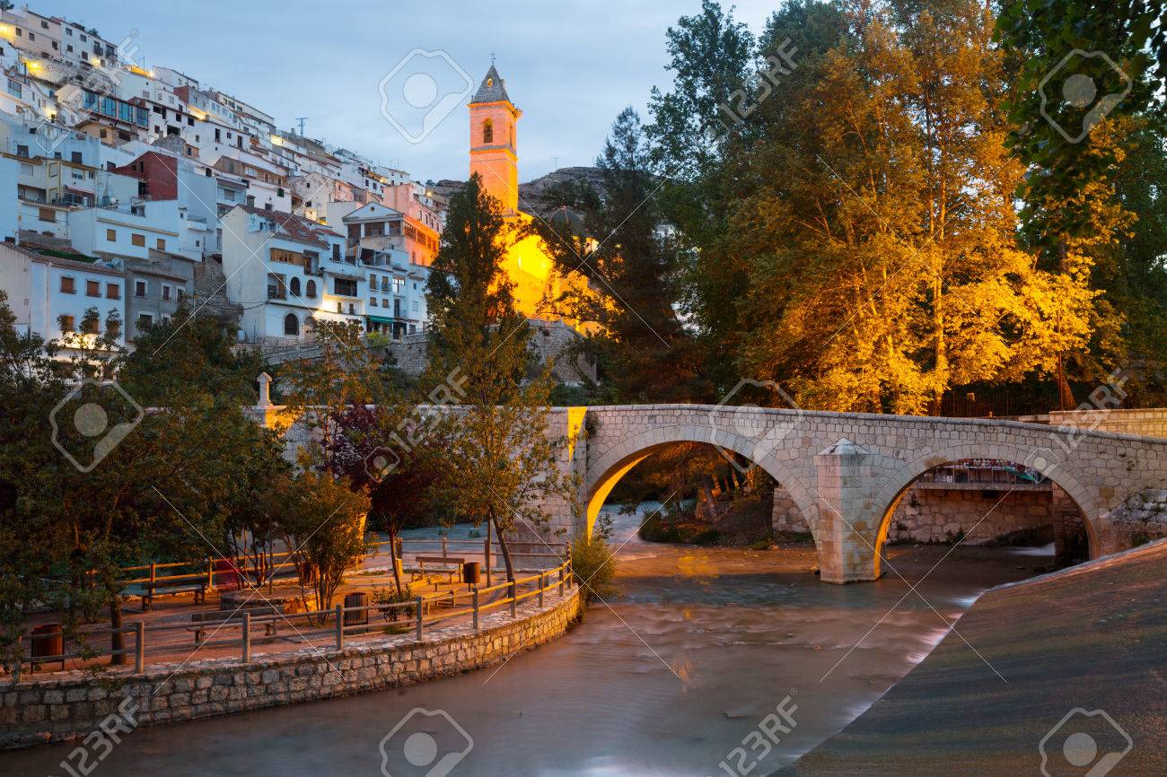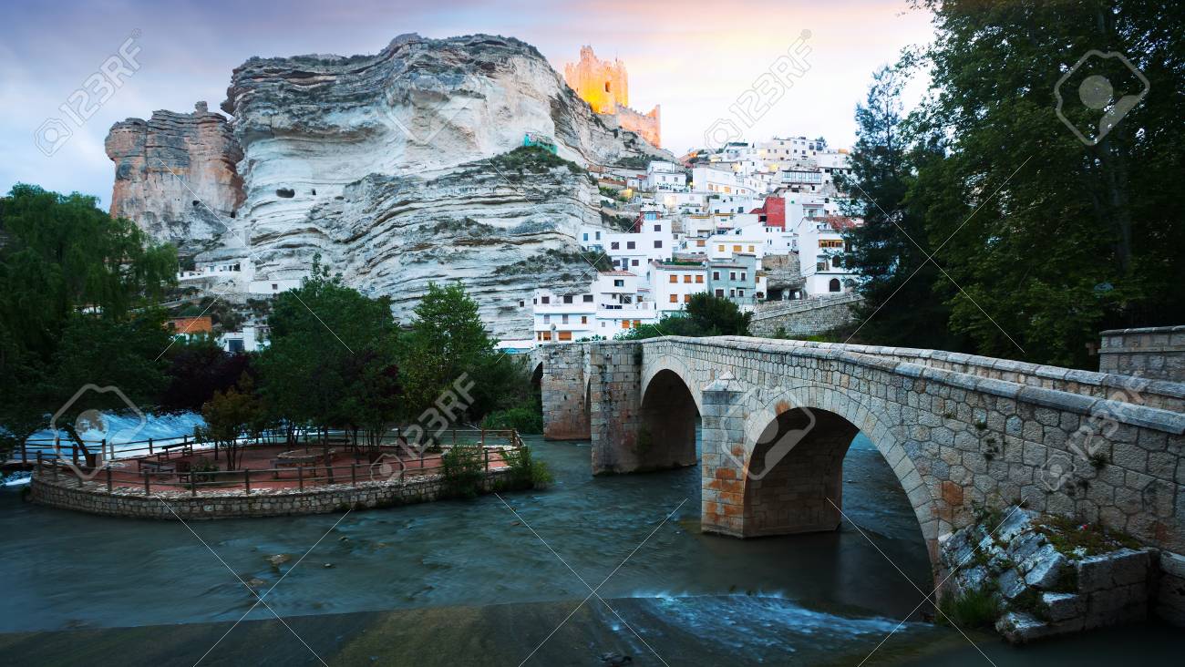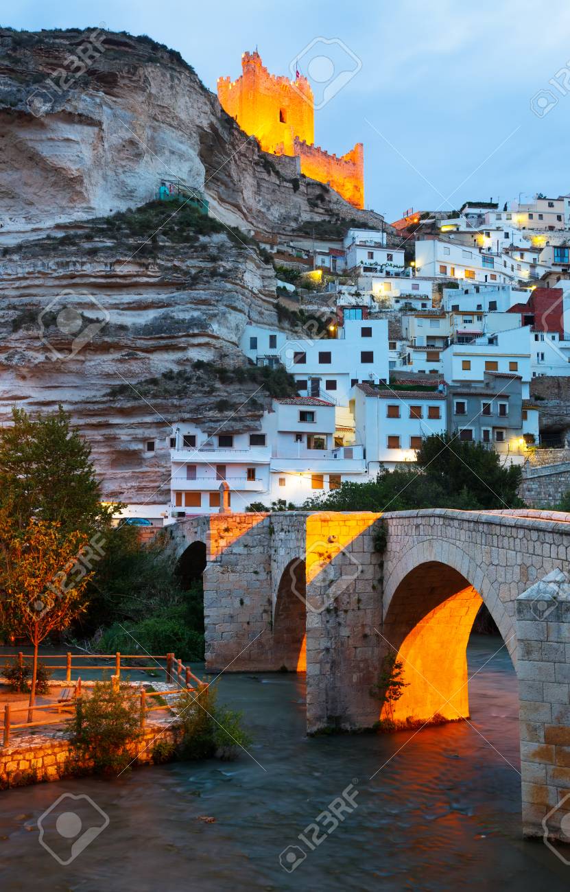 Immagini Stock Vista Serale Di Alcala Del Jucar Con Castello E Ponte Provincia Di Albacete In Spagna Image