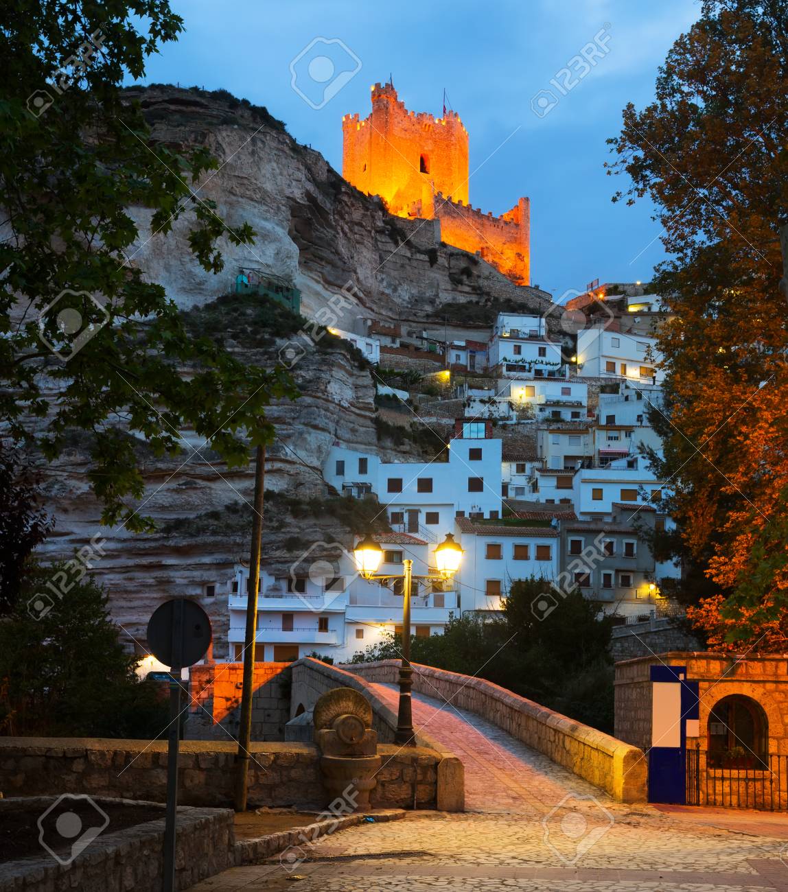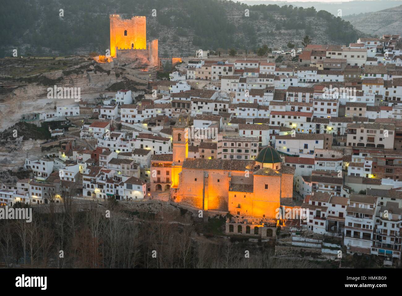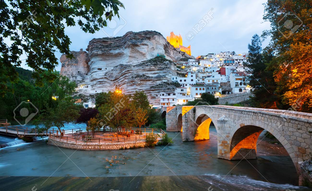 Immagini Stock Vista Serale Di Alcala Del Jucar Con Castello E Ponte Provincia Di Albacete In Spagna Image