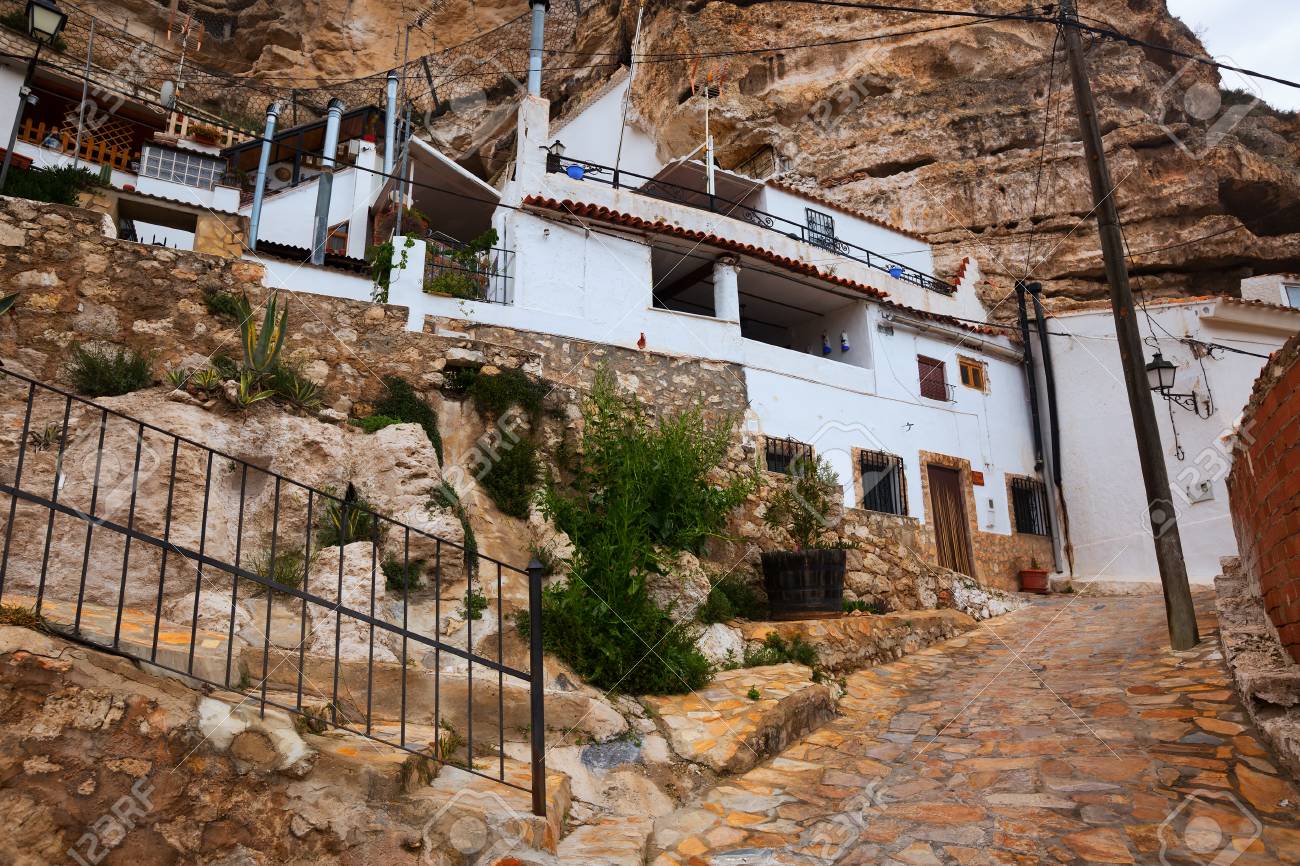 Immagini Stock Citta Con Abitazioni Case Grotte Costruito Nella Roccia Alcala Del Jucar Provincia Di Albacete Spagna Image