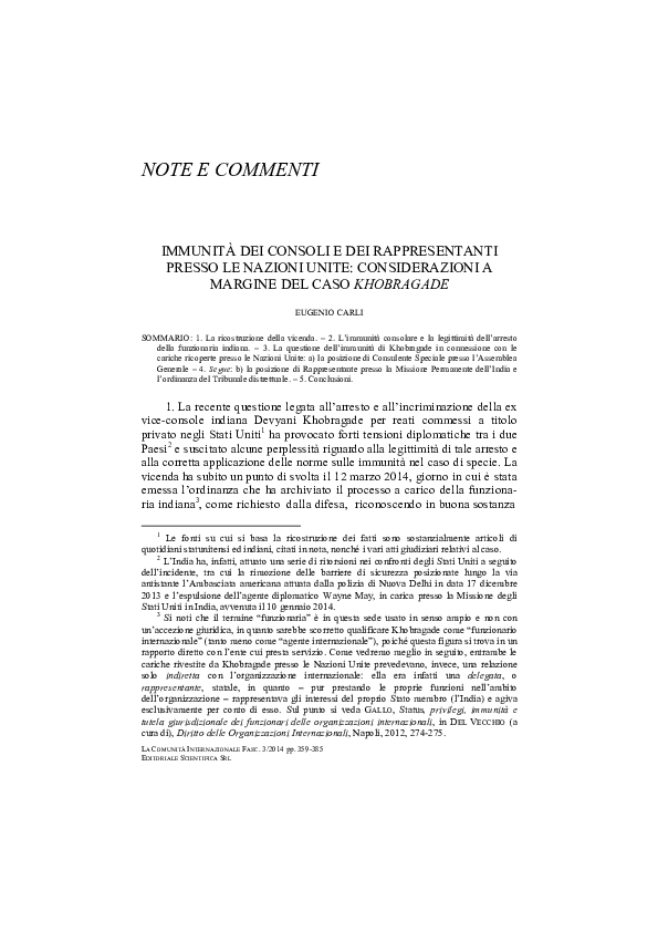 Immunita Dei Consoli E Dei Rappresentanti Presso Le Nazioni Unite Considerazioni A Margine Del Caso Khobragade Eugenio Carli Academia Edu