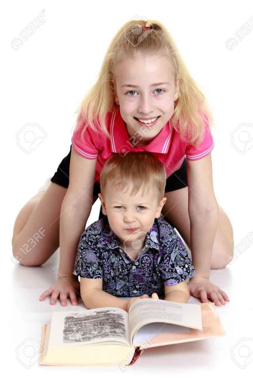 Big Sister And Little Brother Reading A Book Lying On The Floor Isolated Stock Photo Picture And Royalty Free Image Image