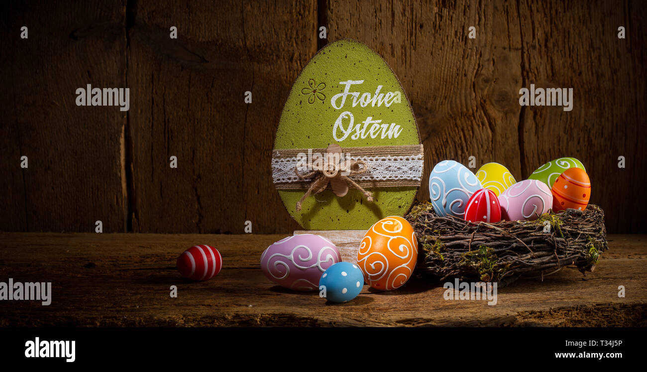 Saluti Tedeschi Frohe Ostern Traduzione Inglese Buona Pasqua Verniciato Colorato Le Uova Nel Nido Di Uccelli Cesto Su Rustici Di Legno Vecchio Biglietto Di Auguri Pano Foto Stock Alamy