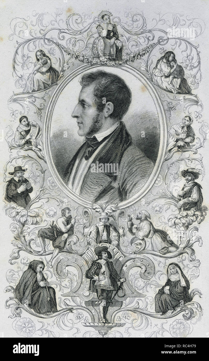 Alessandro Manzoni 1785 1873 Italian Writer And Poet The Betrothed His First Novel Published In 17 Engraving Of The Author Belonging To The Second Edition Framed By Depictions Of Characters Of The Betrothed
