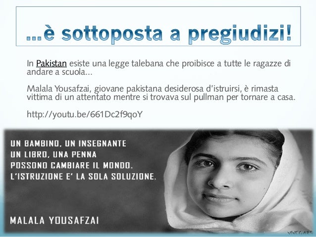 In tutti i secoli, e in ogni parte del pianeta, le donne hanno dovuto lottare, e purtroppo ancora oggi lottano, per ottenere il diritto all’istruzione Basta ricordare la vicenda di Malala – vincitrice del premio Nobel per la Pace nel 14 – e la sua coraggiosa e tenace lotta per garantire alle bambine di studiare in tutti quei territori dove il fondamentalismo ed il terrorismo islamico. La dichiarazione è stata recepita dagli stati membri dell'ONU nel 1948, con l'articolo 26 garantisce il diritto all'istruzione e per renderlo effettivo si consiglia la gratuità e obbligatorietà dei livelli fondamentali e l'accesso su base di merito ai livelli superiori Lo stesso articolo continua insistendo anche sulla qualità e il fine. L'Istruzione Nel Mondo > > > Approfondimenti Links Chi siamo;.