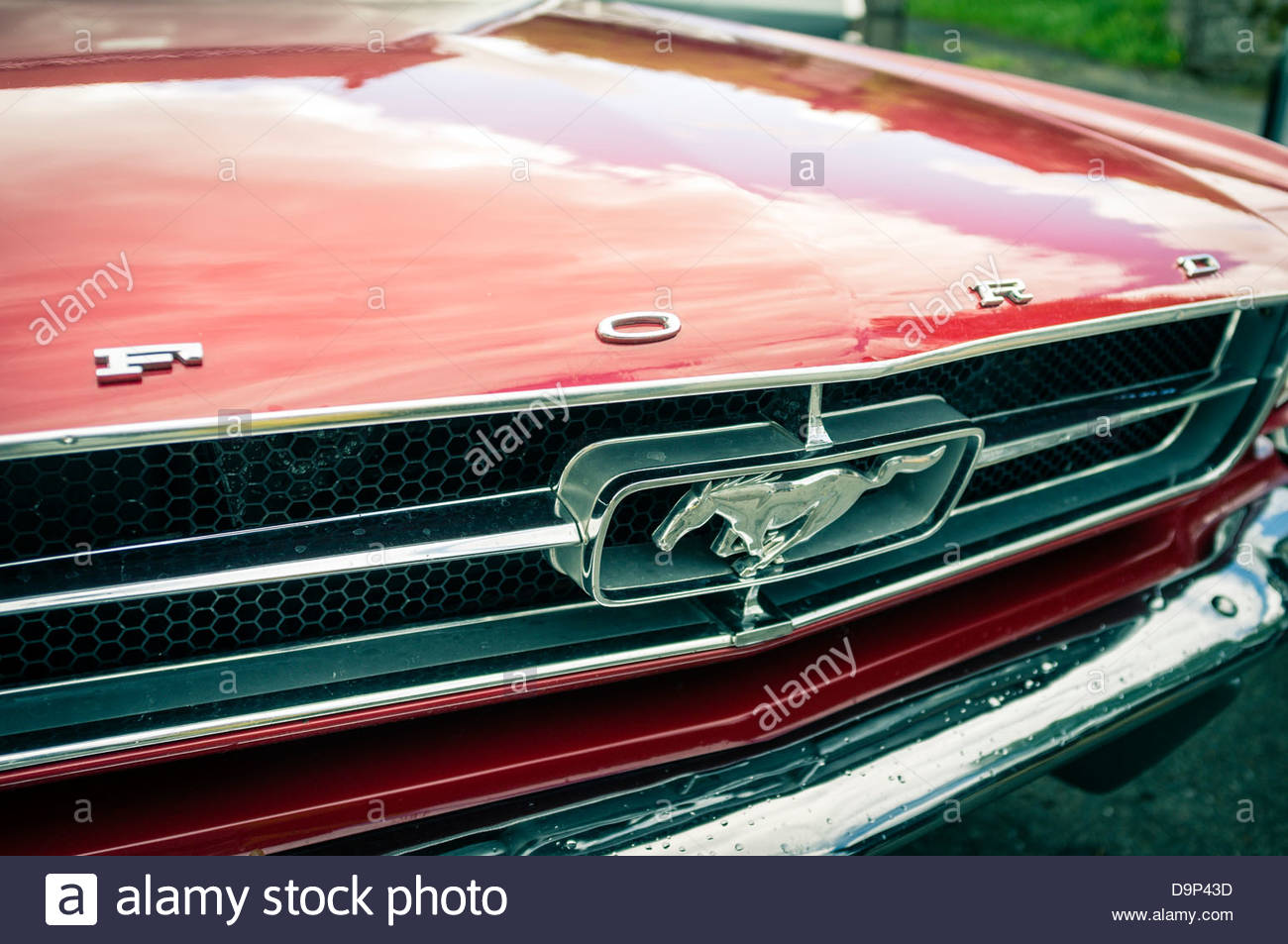 Logo Ford Mustang E Stemma Sulla Griglia Anteriore Di Un Rosso 1965 Prima Generazione Ford Mustang Coupe Foto Stock Alamy