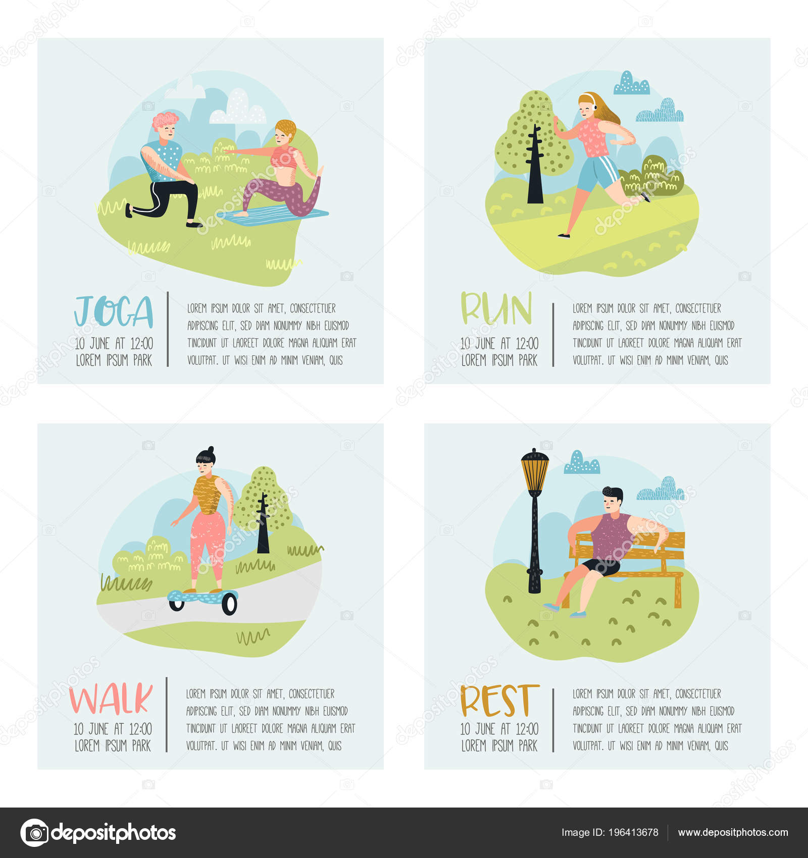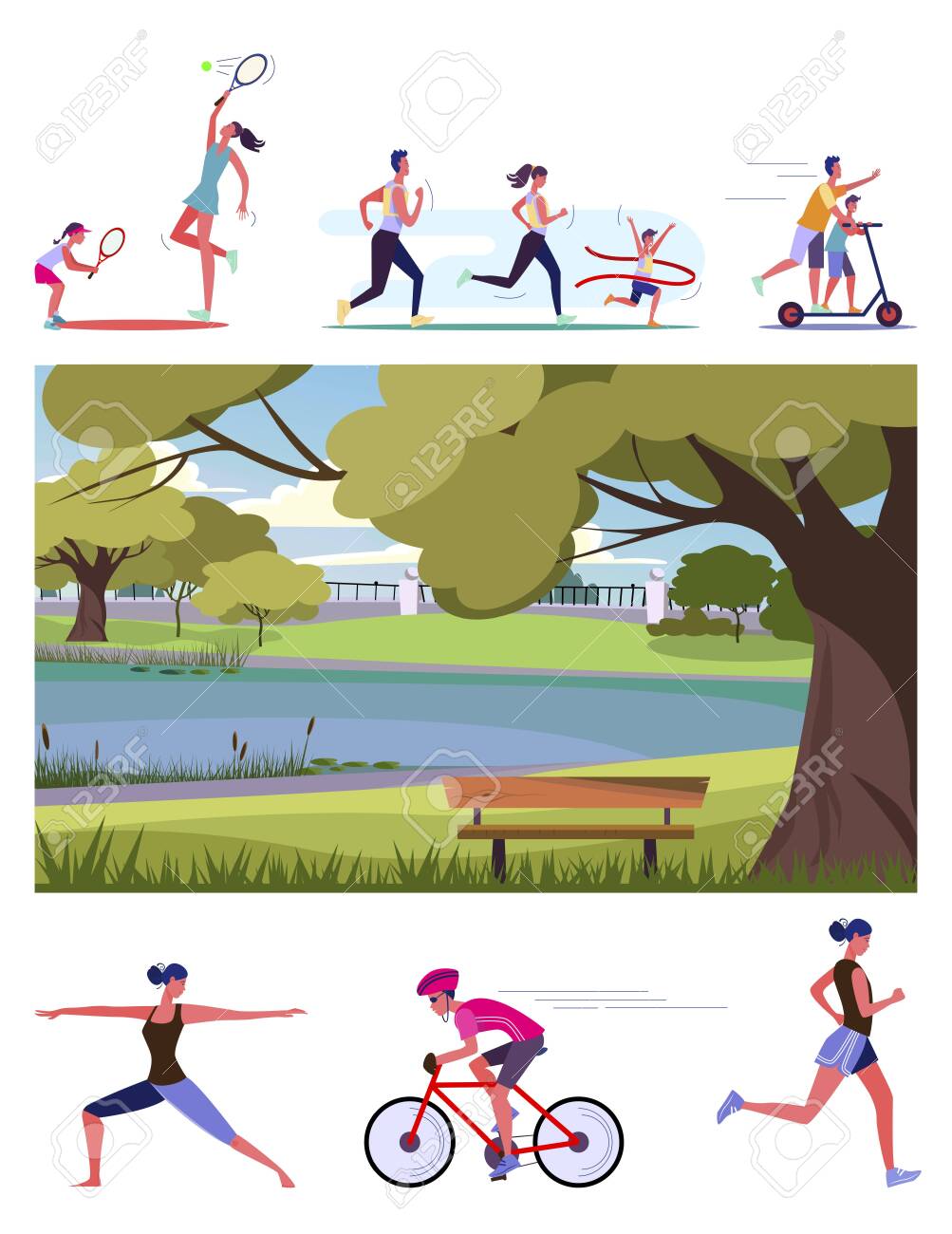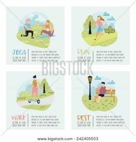 Summer Outdoor Sports Activities Active People In The Park Poster Banner Running Yoga Roller Fitness Characters Doing Canstock