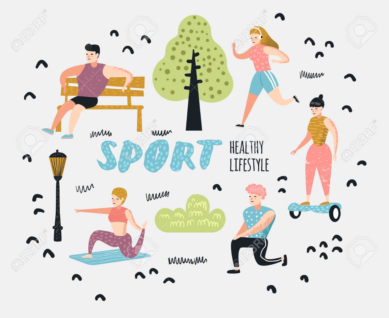 Summer Outdoor Sports Activities Active People In The Park Doodle Running Yoga Roller Fitness Characters Doing Workout Canstock