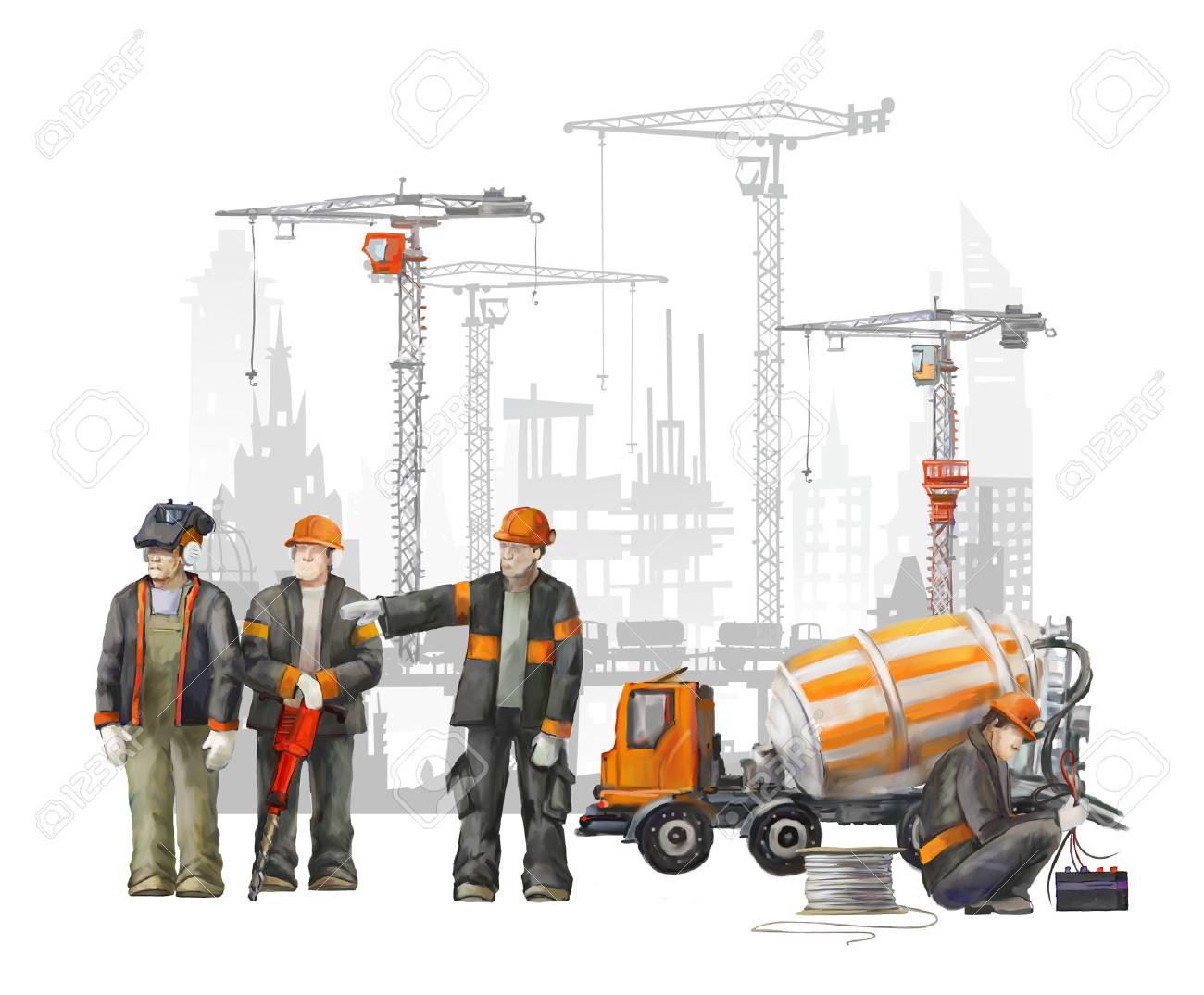 Builders On The Building Site Industrial Illustration With Workers Cranes And Concrete Mixer Machine Stock Illustration Illustration Of Industry Deputy
