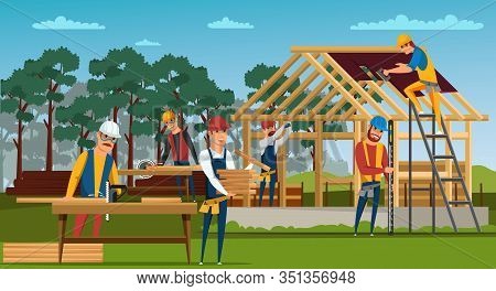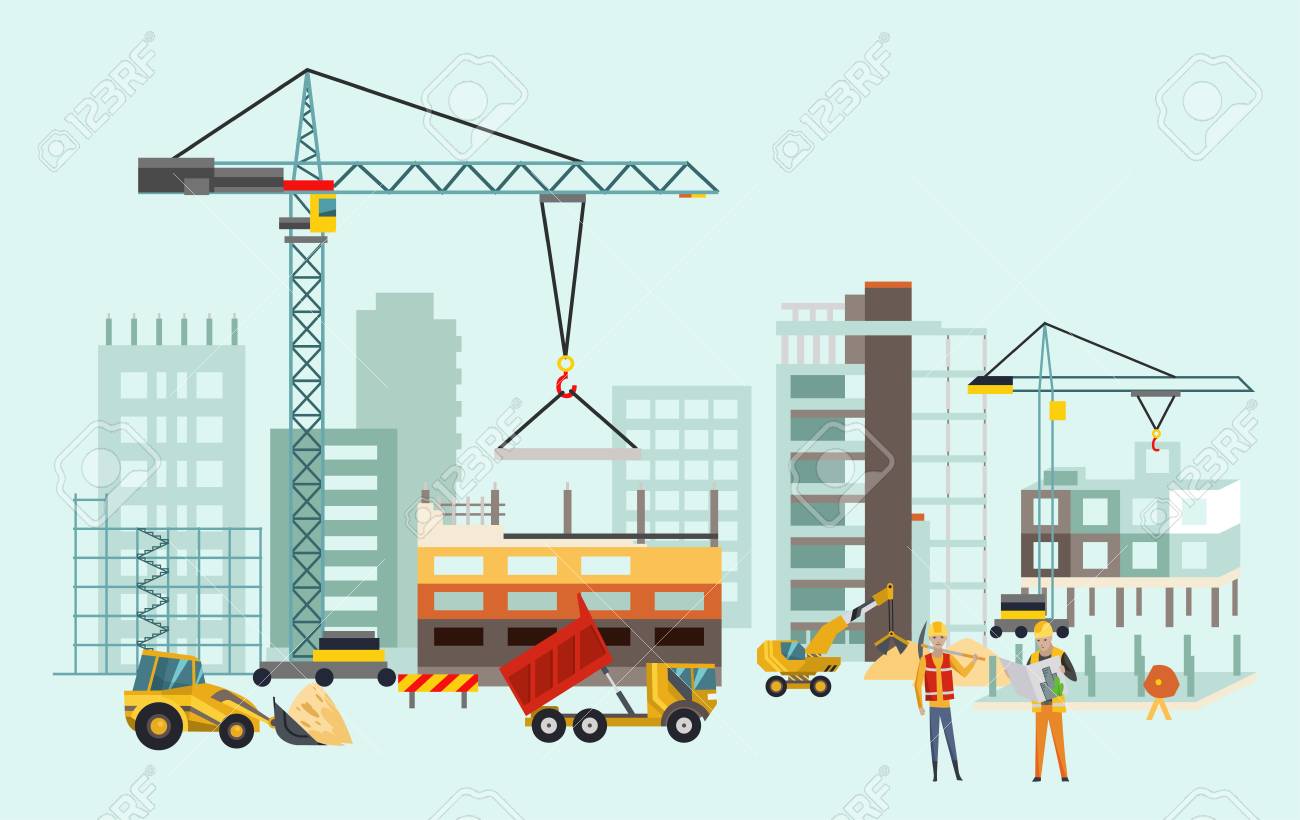Builders On The Construction Site Building Work Process With Houses And Construction Machines Vector Illustration With People Stock Vector C The8monkey Gmail Com