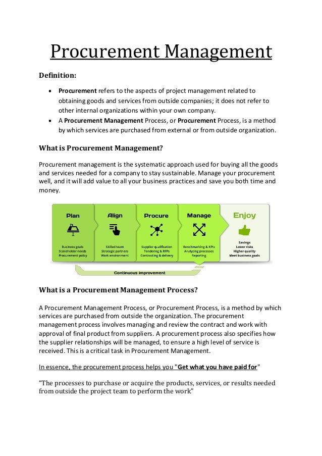 Single signon is enabled Click to reopen login window. The procurement management plan, like all other management plans, becomes a subsidiary of the project management plan and the processes for resolving conflicts and improving work processes Managing the Contracts The contract type determines the level of effort and the skills needed to manage the contract The manager of supplier. Procurement Management Process The 21 Guide Paperdriven procurement has a cascading effect on an organization's bottom line Manual inefficiencies cost organizations a huge chunk of cash in long purchase cycles, missed discounts, and transaction disputes.
