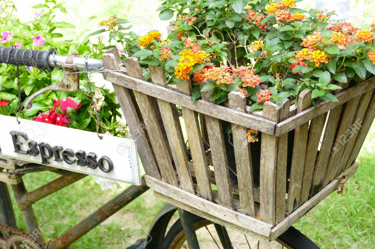 Immagini Stock La Vecchia Bicicletta Nera Arrugginita Con Il Vaso Di Fiore In Canestro Di Legno E Segno Del Caffe Espresso Sull Iarda Del Prato Inglese Image