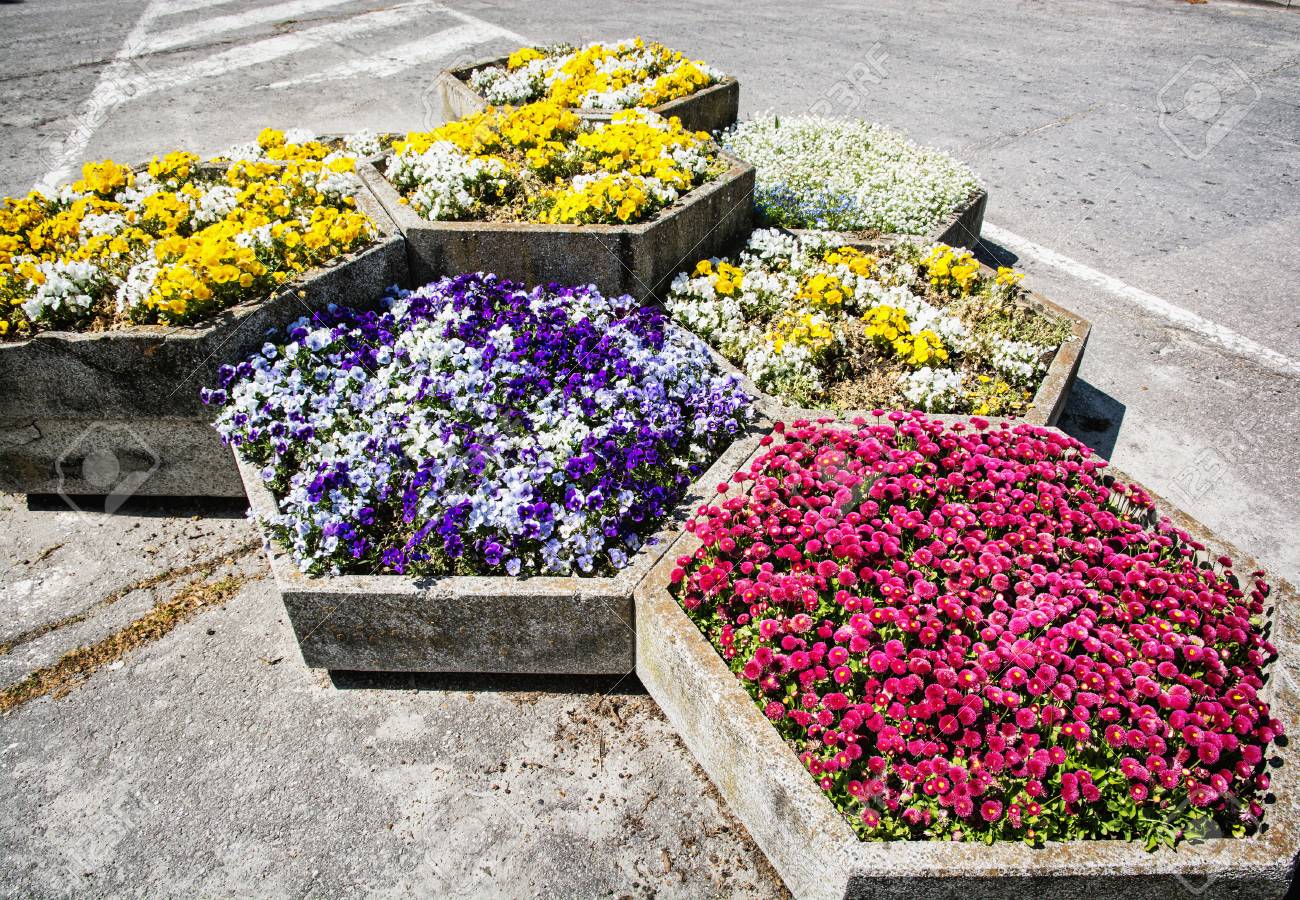 Immagini Stock Vasi Con Vari Fiori Di Giardinaggio In Citta Viole Del Pensiero E Rosa Margherite Inglese Via Decorazione Naturale Scena Stagionale Bellissimi Fiori Image