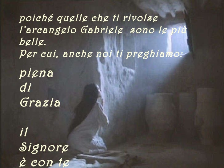 "Ave, Maria, piena di grazia" così comincia la preghiera che ci viene insegnata fin da bambini e che, soprattutto nelle difficoltà, riaffiora sulle labbra e nei cuori "Dio saluta una donna, la saluta con una verità grande 'Io ti ho fatto piena del mio amore, piena di me, e così come sarai piena di me sarai piena del mio Figlio e poi di. Ave Maria, piena di grazia, eletta fra le spose e le vergini sei tu, sia benedetto il frutto, o Benedetta, di tue materne viscere, Gesù Prega per chi, adorando te, si prostra, prega pel peccator, per l'innocente, e pel debole oppresso e pel possente, misero anch'esso, tua pietà dimostra Prega per chi sotto l'oltraggio piega la fronte,. Ave, Maria, piena di grazia, il Signore è con te PensieriParole Ave, Maria, piena di grazia, il Signore è con te Tu sei benedetta fra le donne e benedetto è il frutto del tuo seno, Gesù Santa Maria, Madre di Dio, prega per noi peccatori, adesso e nell'ora della nostra morte.