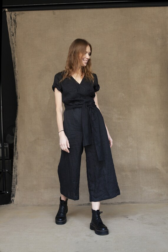 Black Linen Jumpsuit Wrap Linen Jumpsuit With Belt Wide Leg Etsy
