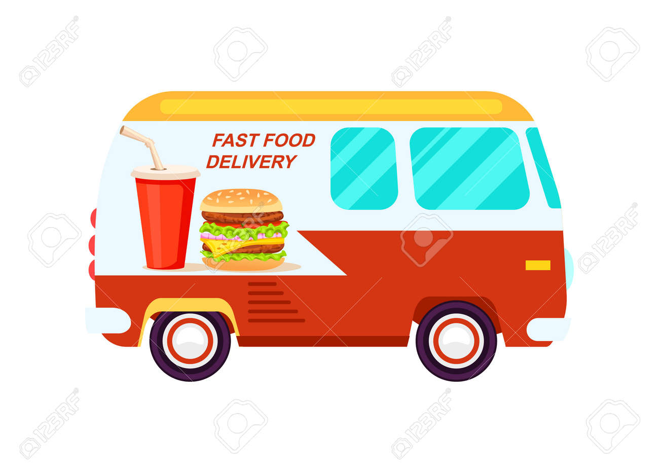 Vettoriale Icona Di Furgone Consegna Fast Food Ordina Il Cibo A Casa La Pubblicita Di Spedizione Del Prodotto Etichetta Di Servizio Di Consegna Espressa Di Cibo Ristorante Con Furgone Commerciale Image