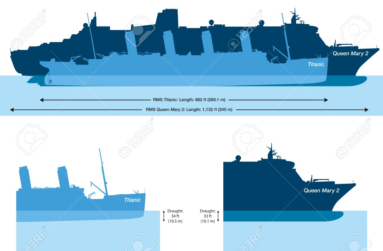 Vettoriale Confronto Dimensioni E La Profondita Dell Acqua Al Titanic E Queen Mary 2 La Piu Grande Nave Atlantico Nell Illustrazione Vettoriale Mondo Con Trasparenze Image