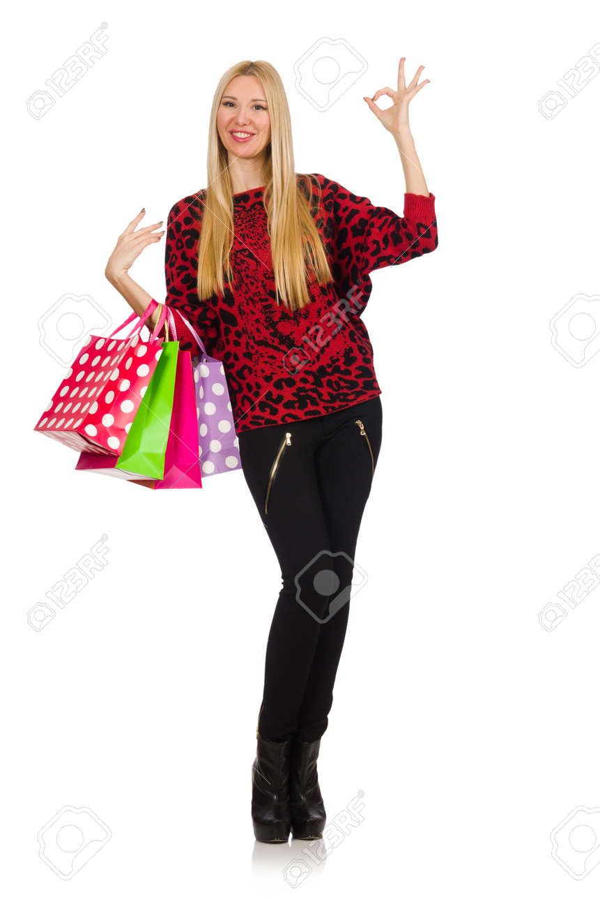 Donna Felice Dopo Buon Shopping Isolato Su Bianco Foto Stock Alamy