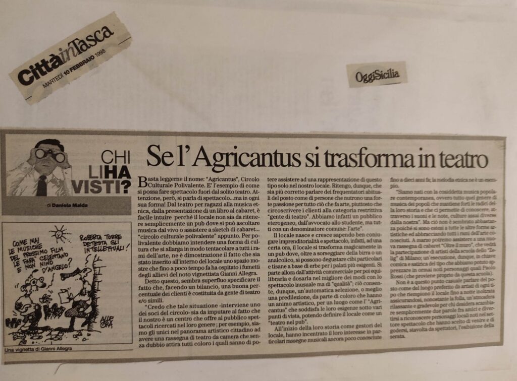 Sostienici Siamo un gruppo di persone accomunate dalla passione per la Sicilia, ma soprattutto. Tutti gli eventi ». Teatro Agricantus, Palermo Mi piace · 2 persone ne parlano · 3341 persone sono state qui Pagina Ufficiale del Teatro Agricantus di Palermo Qui troverete le info su tutti i nostri.