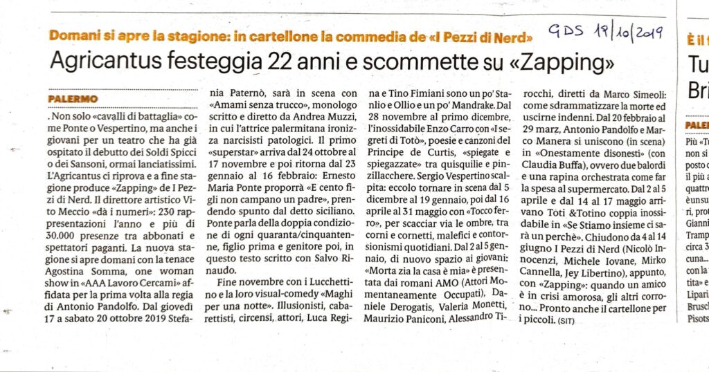 Sergio Vespertino vi aspetta i due prossimi fine settimana di settembre all'Agricantus di Palermo con due spettacoli della sua divertente Trilogia che ci ha accompagnato durante il mese di agosto Papà a la coque (dal 7 al 9 Settembre) e Fiato di madre (dal 14 al 16 Settembre). BIGLIETTI ESAURITI TEATRO AGRICANTUS PALERMO VIA NICOLO' GARZILLI INFOLINE 091 DAL 5 AL 8 GENNAIO 17 A GRANDE RICHIESTA AGGIUNTA REPLICA 8 GENNAIO ORE 2130 Avvisiamo il Gentile pubblico che lo spettacolo di Roberto Lipari dal titolo "Parlo col muro" è stato sostituito dal titolo "Divanazioni riveduto e scorretto" Per procede all'acquisto online dovete comunque selezionare il. PROSSIMI EVENTI 1610 Asta FELLINI ONIRICO a sostegno di Emergency Livorno C’È MUSICA IN CASA – MARIO CRISPI fiatista degli AGRICANTUS C’è Musica in casa 100 PALCHI APERTI PER EMERGENCY Dal 28 al 30 Aprile da tutta Italia in streaming su Facebook, Instagram e Youtube Oltre 100 musicisti per EMERGENCY in diretta da casa.