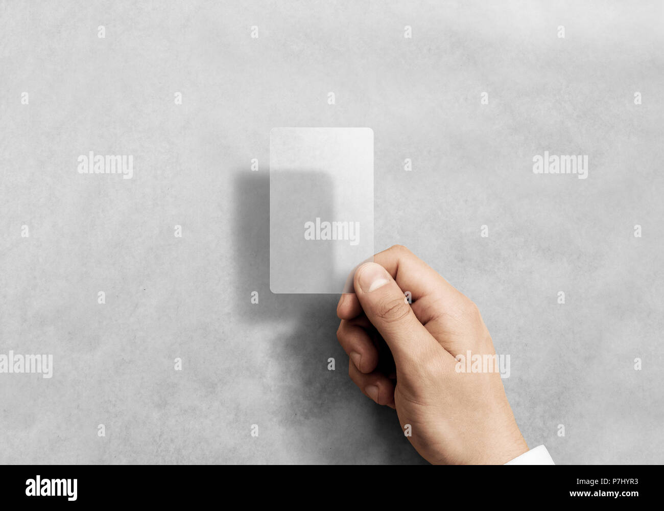 Tenere In Mano Blank Verticale Carta Traslucida Mockup Con Angoli Arrotondati Plain Cancella Chiamata Card Mock Up Modello Braccio Di Contenimento Plastica Acrilica Trasparente Biglietti Da Visita Il Display Anteriore Foto Stock