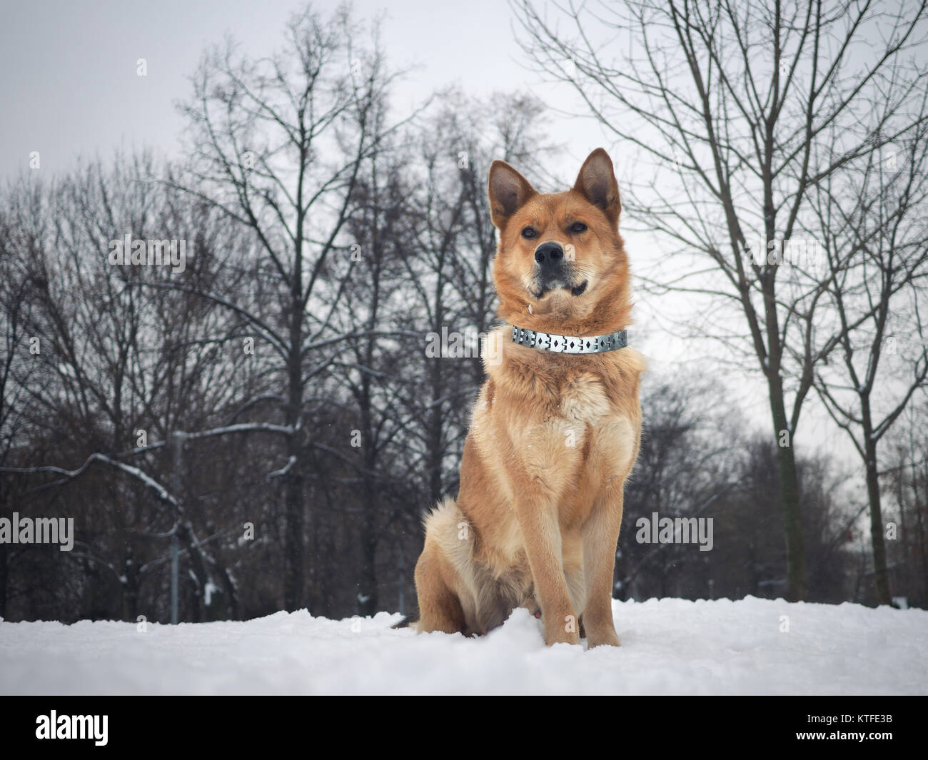 Grande Bellissimo Cane Rosso Inverno La Neve Il Meticcio Akita Inu Foto Stock Alamy