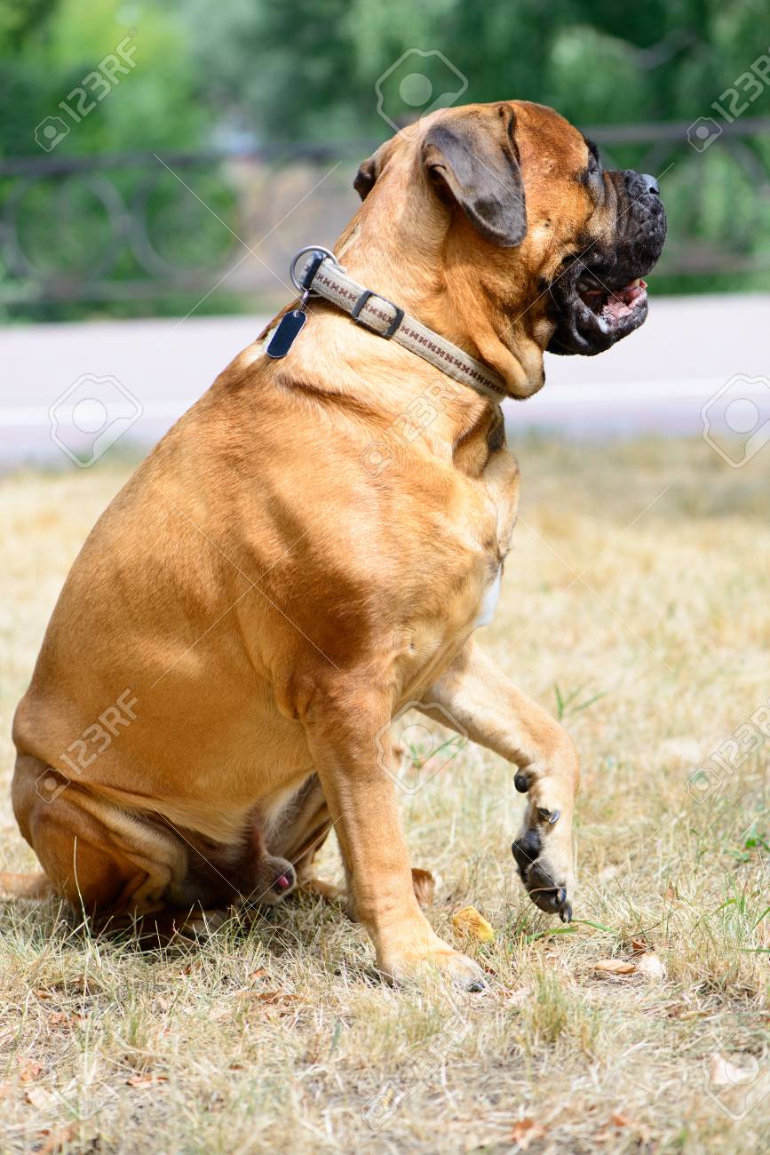 Immagini Stock Pet Grande Bullmastiff Cane Rosso Si Siede Sull Erba Secca E Da La Zampa Image