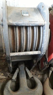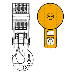 BOZZELLO con gancio bicorno in acciaio, ad articolazione universale, su cuscinetti VERNICIATURA con mano di antiruggine e mano di smalto GRUPPO ARGANI con propulsori costituiti da motori elettrici, di primaria costruzione, accoppiati coassialmente e riduttori in bagno d’olio in presa con tamburi avvolgitori in acciaio. Ricontrollata presso la nostra officina e riverniciata. BOZZELLO per GRU A PONTE a 2 pulegge Two sheaves overhead CRANEBLOCK MOdello 4/1D Verniciato giallo RAL 1003 e nero RAL 9005 Carter in lamiera imbutita Pulegge in acciaio stampato serie ISB Utilizzare preferibilmente la versione in grassetto Model 4/ ID RAL 9005 Black and RAL 1003 yellow painted Steel sheet carter Series ISB forged steel sheaves.