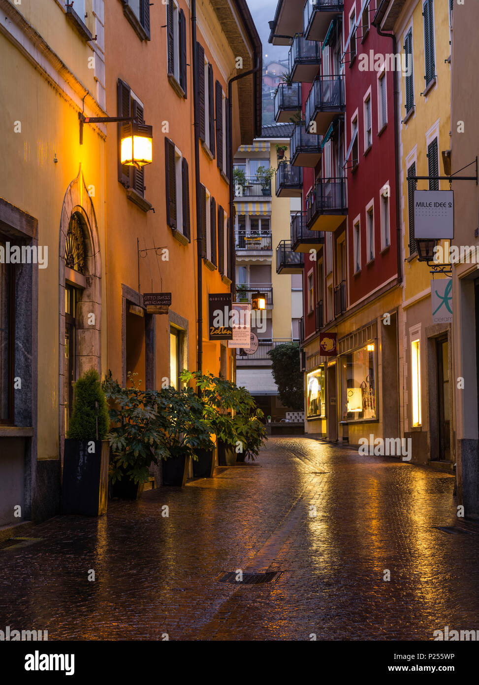 Via Della Motta Durante La Pioggia Nella Citta Vecchia Di Locarno In Serata Foto Stock Alamy