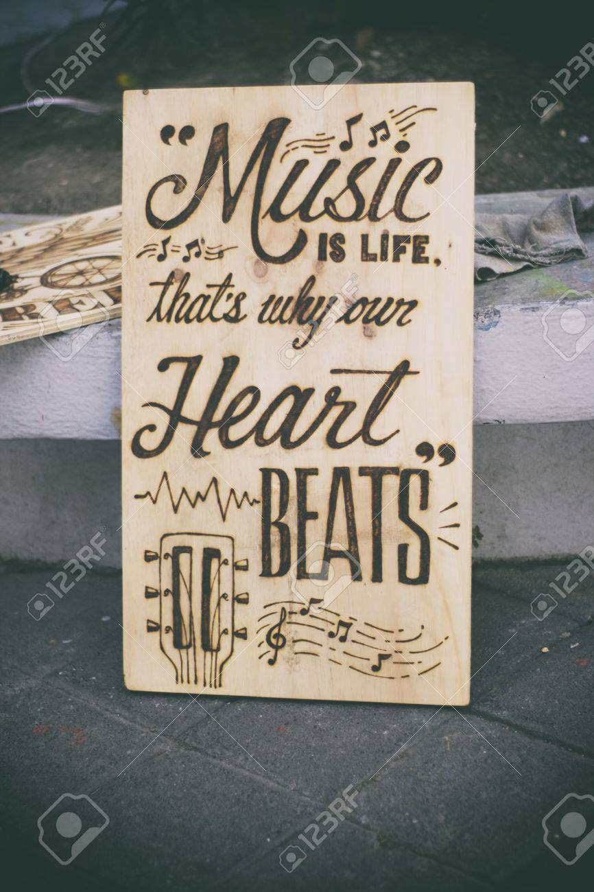 Fotografia Della Frase La Musica E Vita Ecco Perche Il Nostro Cuore Batte Bruciato Scritto Su Un Pezzo Di Legno Foto Stock Alamy