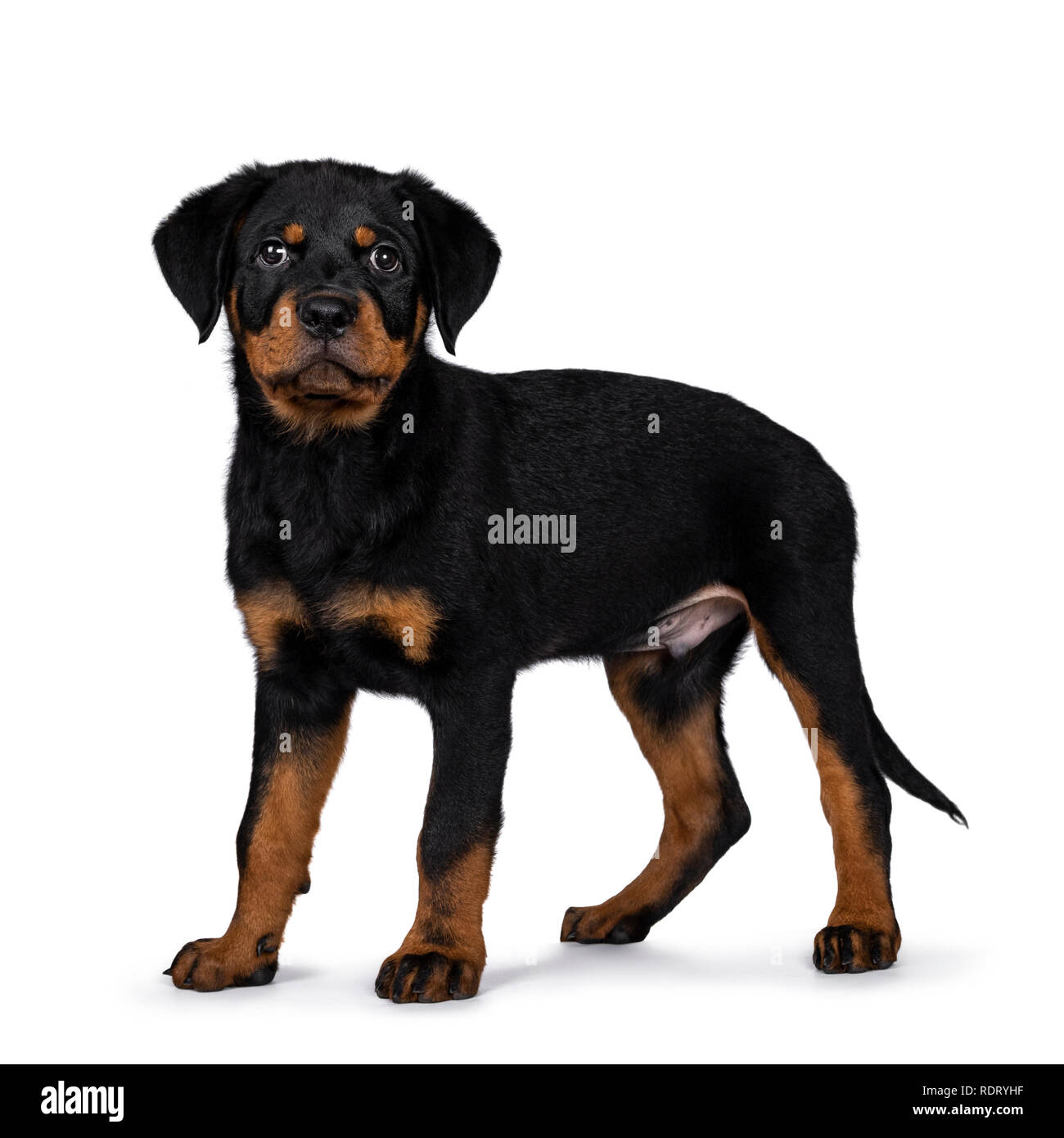 Cute Rottweiler Dog Puppy Standing Side Ways And Straight At Camera With Dark Sweet Eyes Isolated On White Background Tail Hanging Down Stock Photo Alamy