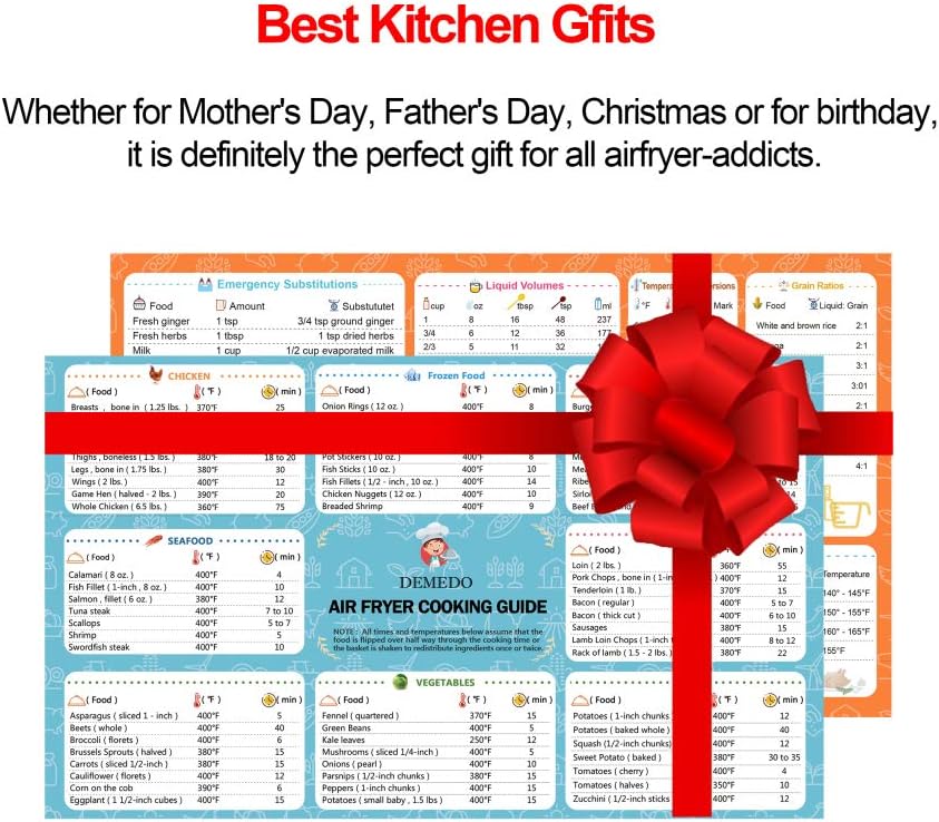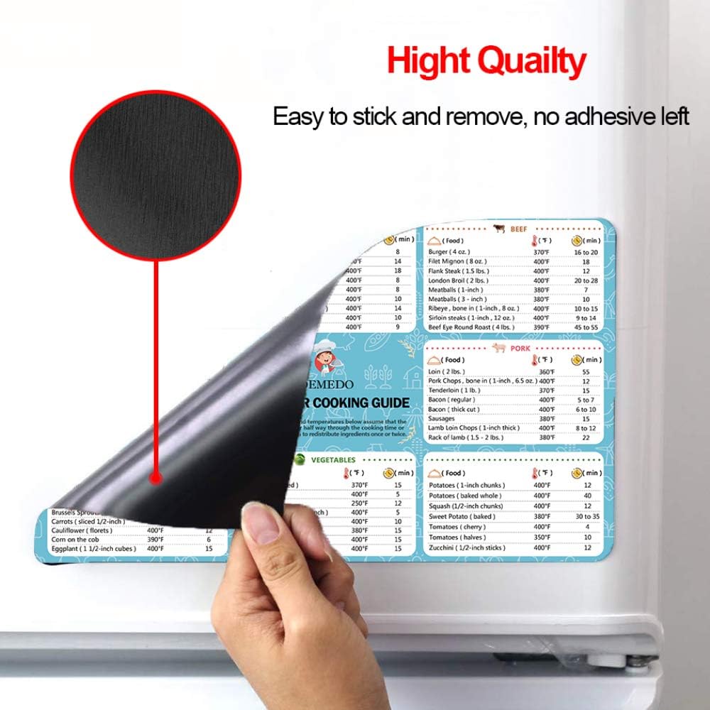 Air Fryer Magnetic Cooking Times Sheet Handy Time Chart Oven Accessories In Kitchen Magnet flip Frozen Instant Fried Cook temperatures Guide Cookbook for Beginners Description MORE ITEMS UPGRADED Other air fryer cheat sheets, They only list times and temperatures for 60~70 foods. Air Fryer Cooking Time Chart Kitchen Cooking Time Guide Conversion Chart Product Description No More Searching The magnetic cheat sheets provides cooking times for 6 kinds of common foods in the air fryer and 6 kinds of common kitchen conversions, which can be quickly referred No need to bother grabbing a cookbook or searching for. To convert an ovencooked recipe to an airfryer one, Mason’s general rule of thumb is to reduce the suggested temperature by 25°F and then cut the cook time by about % Just use the pause button on your machine to occasionally check the doneness and flip for balanced crispness on all sides Deep Fryer to Air Fryer Conversion.